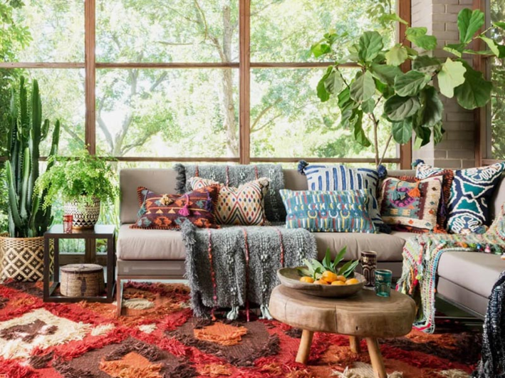 Màu sắc rực rỡ: Boho thường kết hợp các tông màu ấm áp như đỏ, cam, vàng với tông lạnh như xanh lam, xanh lá. Các họa tiết độc đáo và đa dạng như thổ cẩm, hoa văn Morocco cũng xuất hiện thường xuyên.