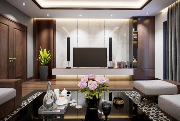 Không gian phòng khách được thiết kế cao, thoáng. Không gian chiều rộng tiết kiệm không gian khi thiết kế một bộ bàn ghế diện tích vừa phải, một kệ ti vi được đặt giáp tường khiến không gian căn phòng trở lên rộng rãi hơn.